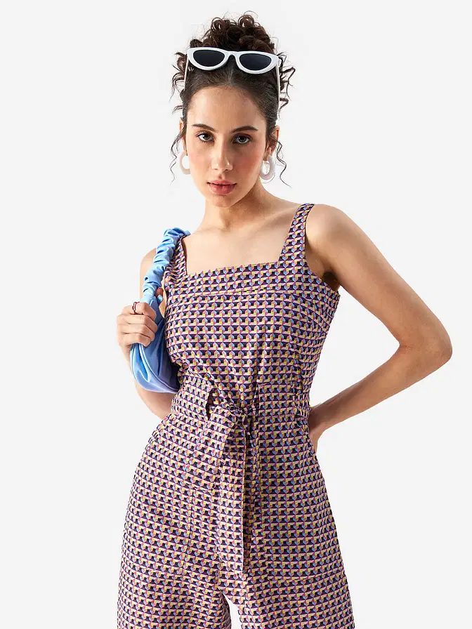 💜 Retro Geometric Print Jumpsuit with Adjustable Belt