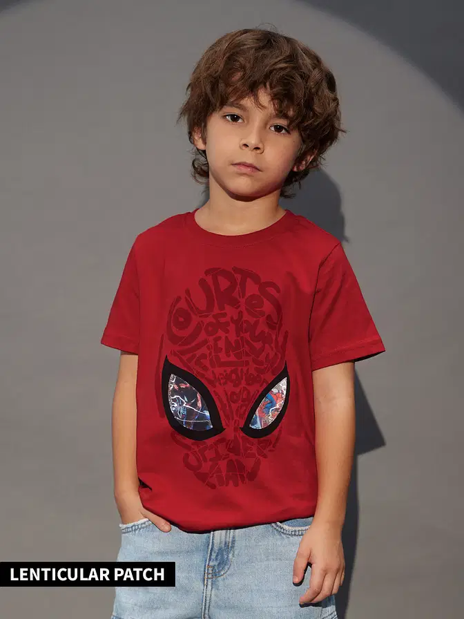 • Cool red tee features a unique “LENTICULAR PATCH” of Spider-Man’s eyes.